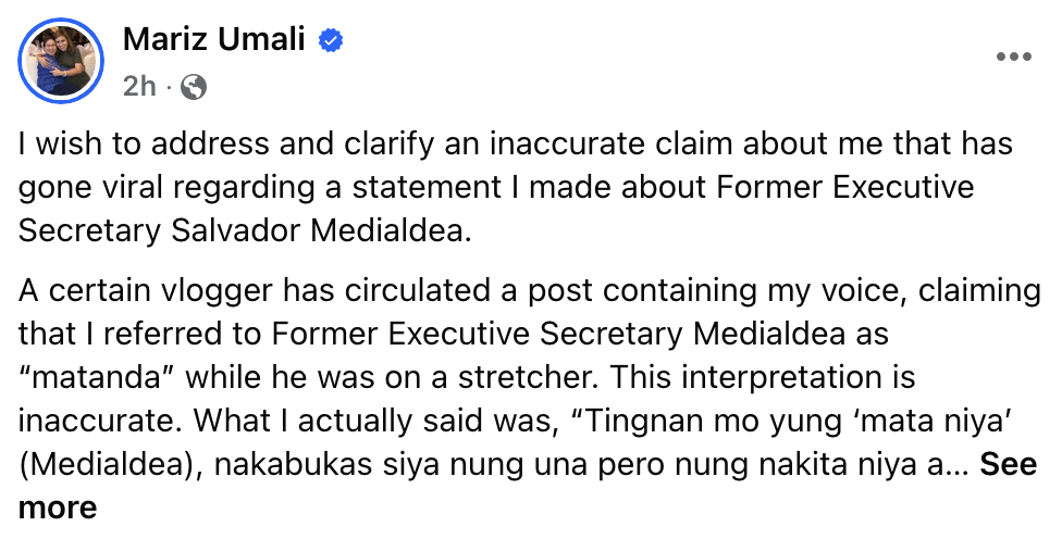 On Facebook, Umali clarified that she never meant any disrespect toward Medialdea. She hopes that people will not believe everything they hear without checking the facts.