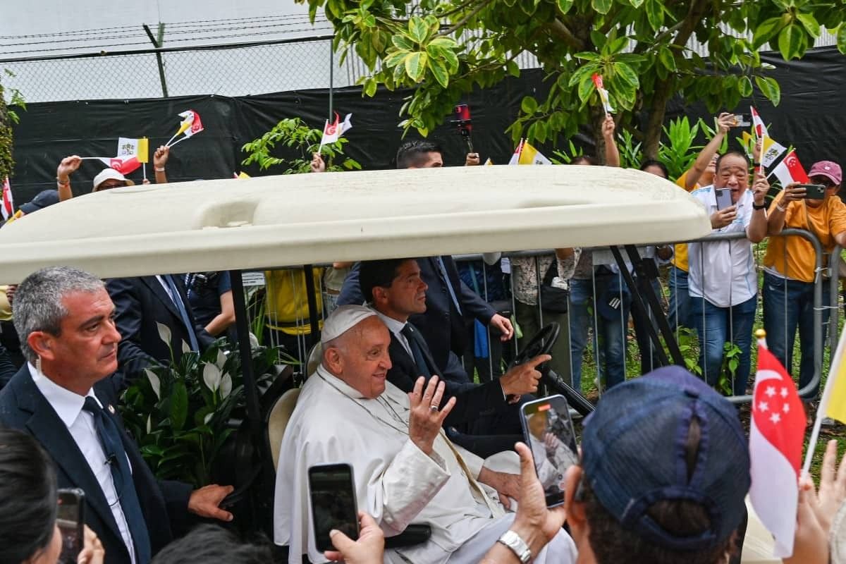 Crowds waved Vatican and Singapore flags as Francis’s plane arrived at the city-state’s Changi Airport, on the last leg of a 12-day tour to the region.