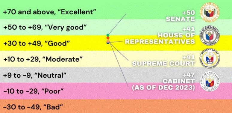The latest poll, conducted from June 23 to July 1, showed that the Senate received a “very good” rating of +50 while the House and the SC both got a “good” rating of +41. Meanwhile, the Cabinet as a whole received a “good” rating of +47 as of December 2023.